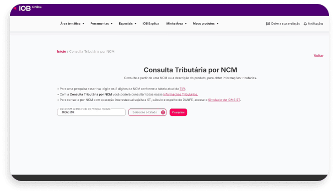 Pesquise com um código NCM, ou a descrição do produto, e o estado para descobrir a tributação aplicável. Garanta que seus produtos estejam com os impostos corretos!