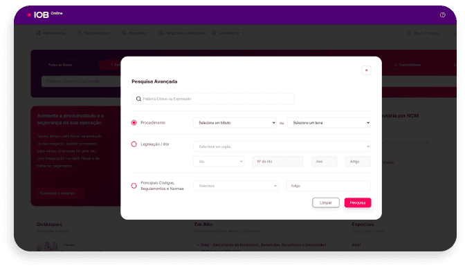 Encontre o que você procura antes mesmo de terminar de digitar ou, se preferir, use a pesquisa avançada com filtros por procedimento, legislação e regulamento.